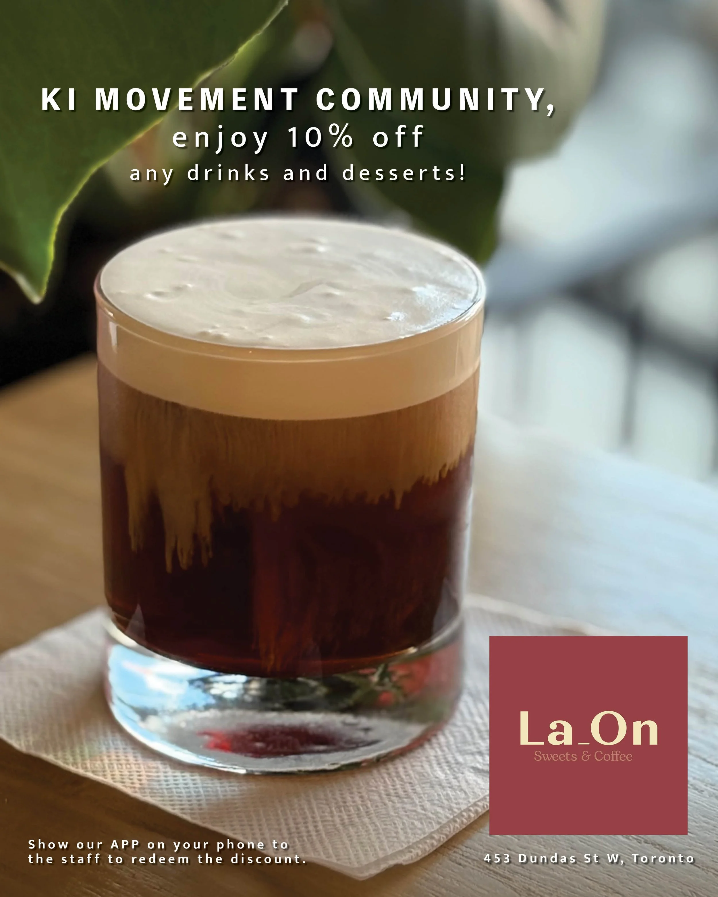 Show our Ki Movement APP on your phone to the staff to get 10% off your order.